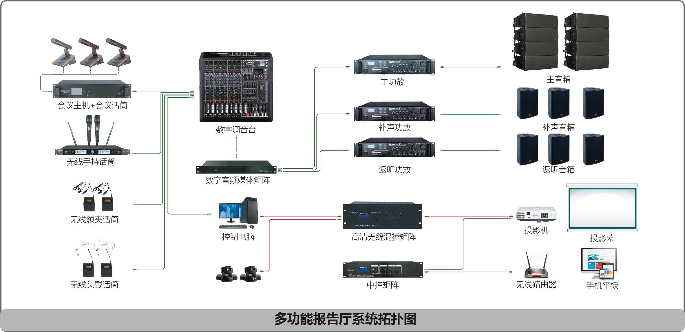 擴(kuò)聲系統(tǒng)是一項(xiàng)系統(tǒng)工程,涉及電子技術(shù)、電聲技術(shù)、建聲技術(shù)和聲學(xué)藝術(shù)等多種學(xué)科,同時(shí)還須與視頻系統(tǒng)(多媒體投影和攝像系統(tǒng))、燈光系統(tǒng)、消防廣播系統(tǒng)、尋呼廣播系統(tǒng)和安保系統(tǒng)等子系統(tǒng)的密切配合和協(xié)調(diào)。擴(kuò)聲系統(tǒng)的音響效果不僅與電聲系統(tǒng)的綜合性能有關(guān),還與聲音的傳播環(huán)境——建筑聲學(xué)和現(xiàn)場(chǎng)調(diào)音使用密切相關(guān)。擴(kuò)聲系統(tǒng)的使用功能和音響效果涉及正確合理的電聲系統(tǒng)設(shè)計(jì)和調(diào)試、良好的聲音傳播條件和正確的現(xiàn)場(chǎng)調(diào)音技術(shù)三者最佳的配合。
