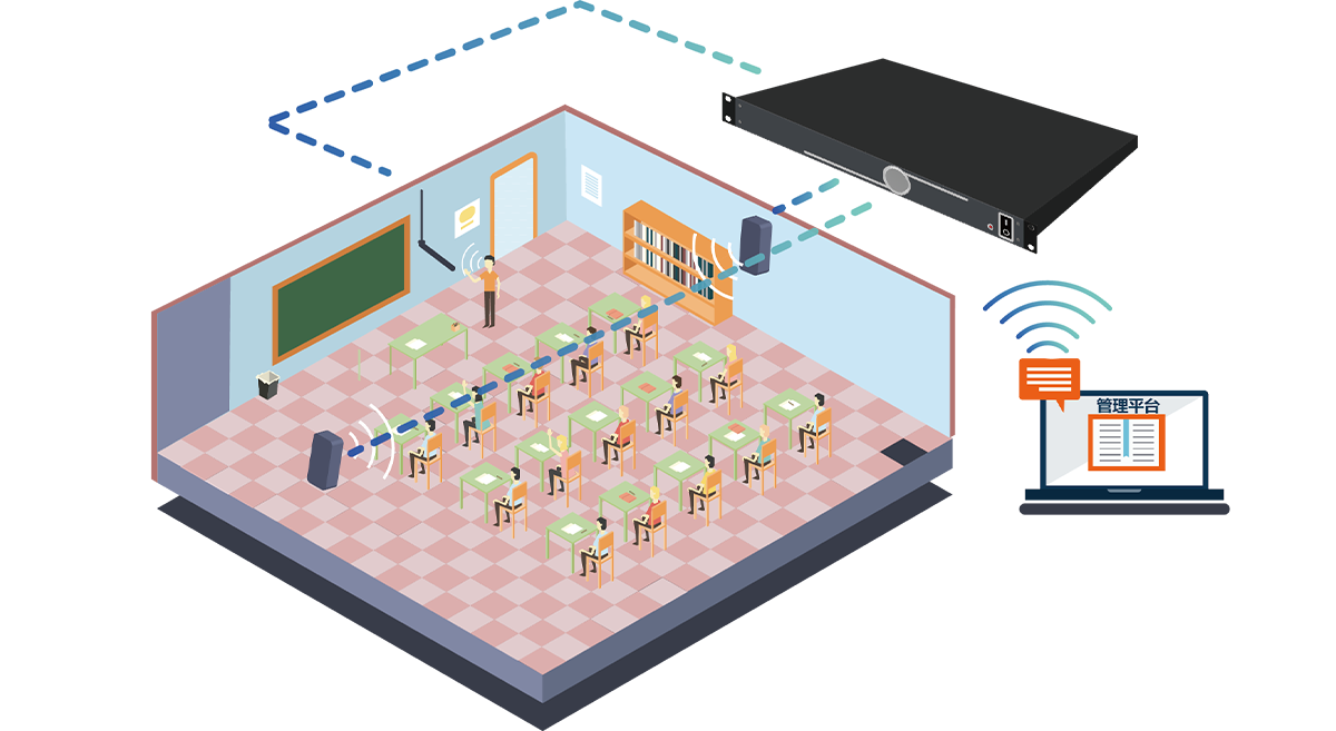 一臺處理器、一支吊麥、四只音箱,即可完善整個教室的拾音、擴音的系統搭建;一個管理平臺,可視化掌控校園各間教室高清語音主機運行狀況。
